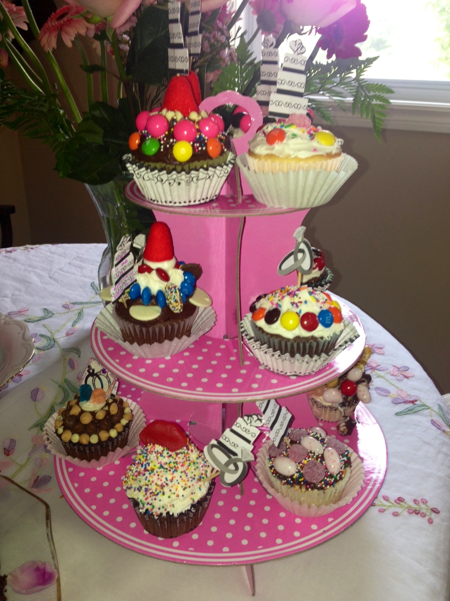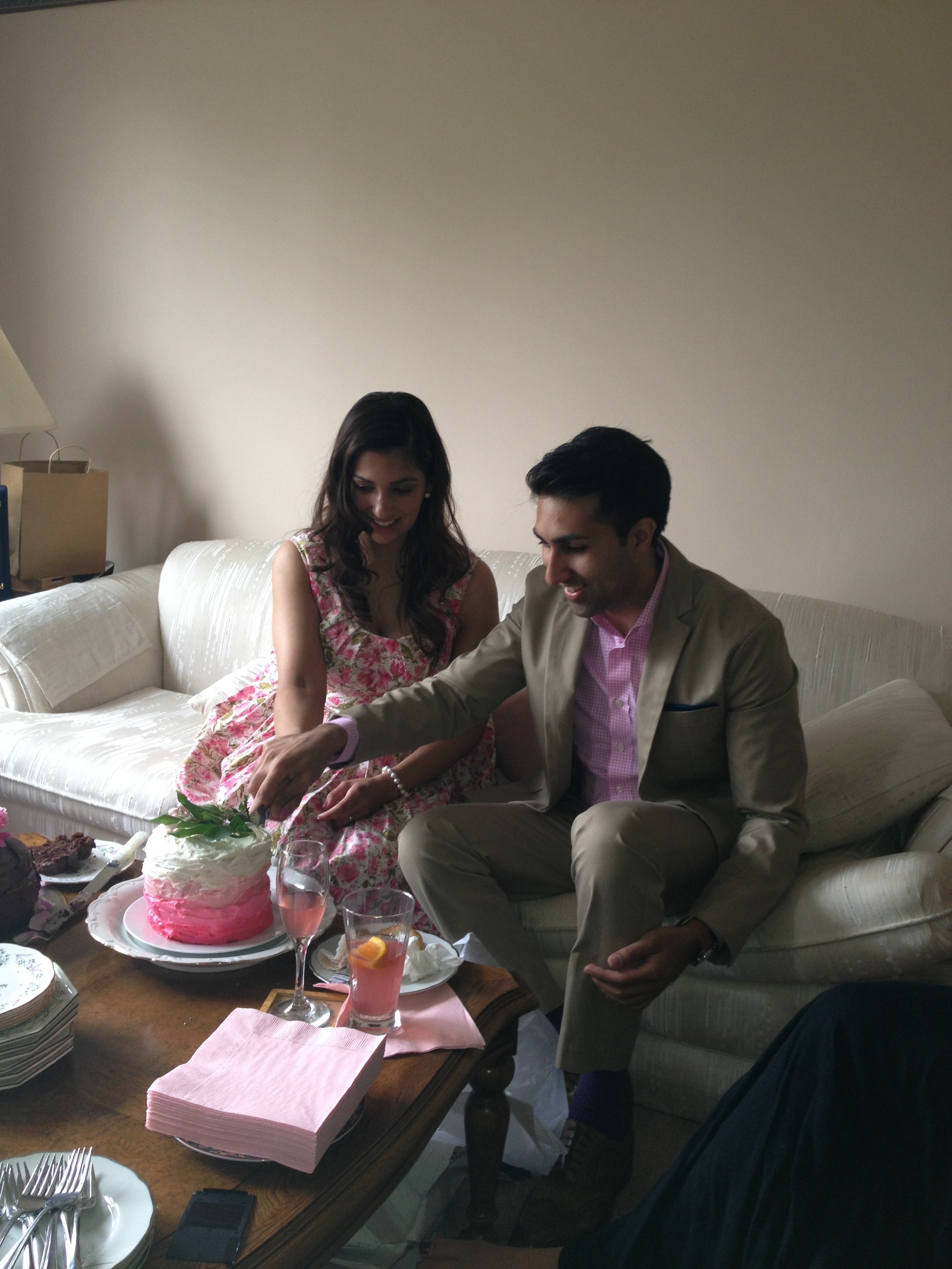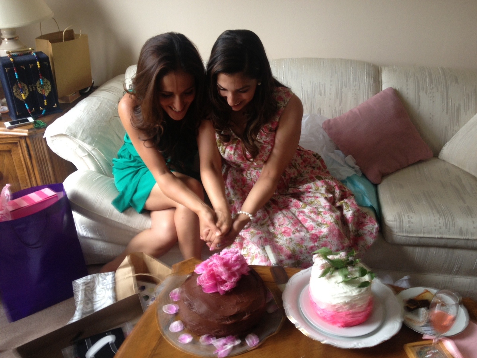 After Kamelia finished making my hair look beautiful, and I was allowed to go downstairs I saw: pink and white balloon decor and tissue hanging from the ceiling of my living room, a table spread of old Victorian looking teacups, the tea pots which my nani amma (grandmother) had given my mom in her Jahez (wedding dowry), 3 tiered platters of my sister’s hand-made high-tea sandwiches, two cakes – one chocolate with a pink peony flower as decor and a pink ombrĂ© cake – which I later found out was made by Emilie herself (prior to she was a baking virgin, and look how beautiful it is below!) a bouquet of pink tulips, daisies and roses which my mom has bought the morning of, my mom’s tea trolly laid out with colorful craft supplies and a fun table in the kitchen full of candy in martini glasses, and a table in the hallway lined with favors.
