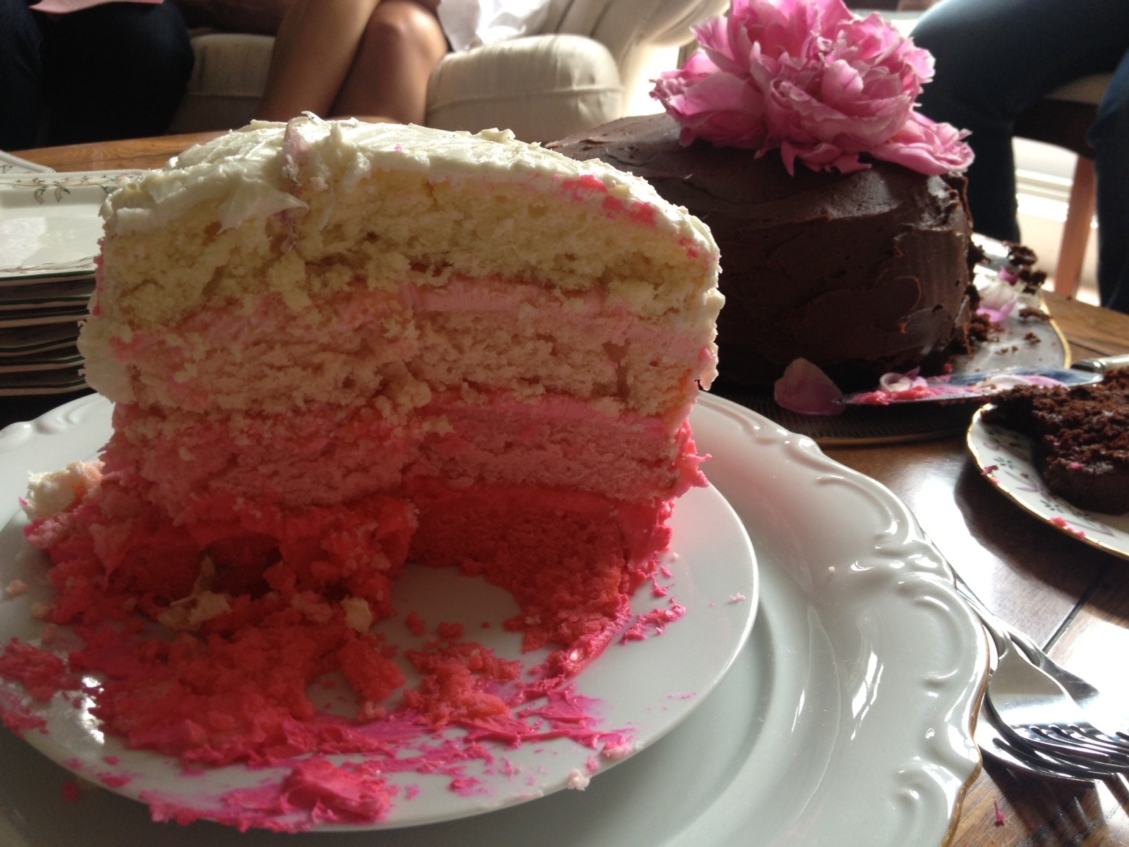 The ombrĂ© cake tasted just as good as it looked and opening the gifts together was a lot of fun: my kitchen will now be equipped with cooking aides, lol. One of the girls Courtney brought me the cutest oven mitt – black foam with a huge diamond stone on the outside finger – tres adorable.