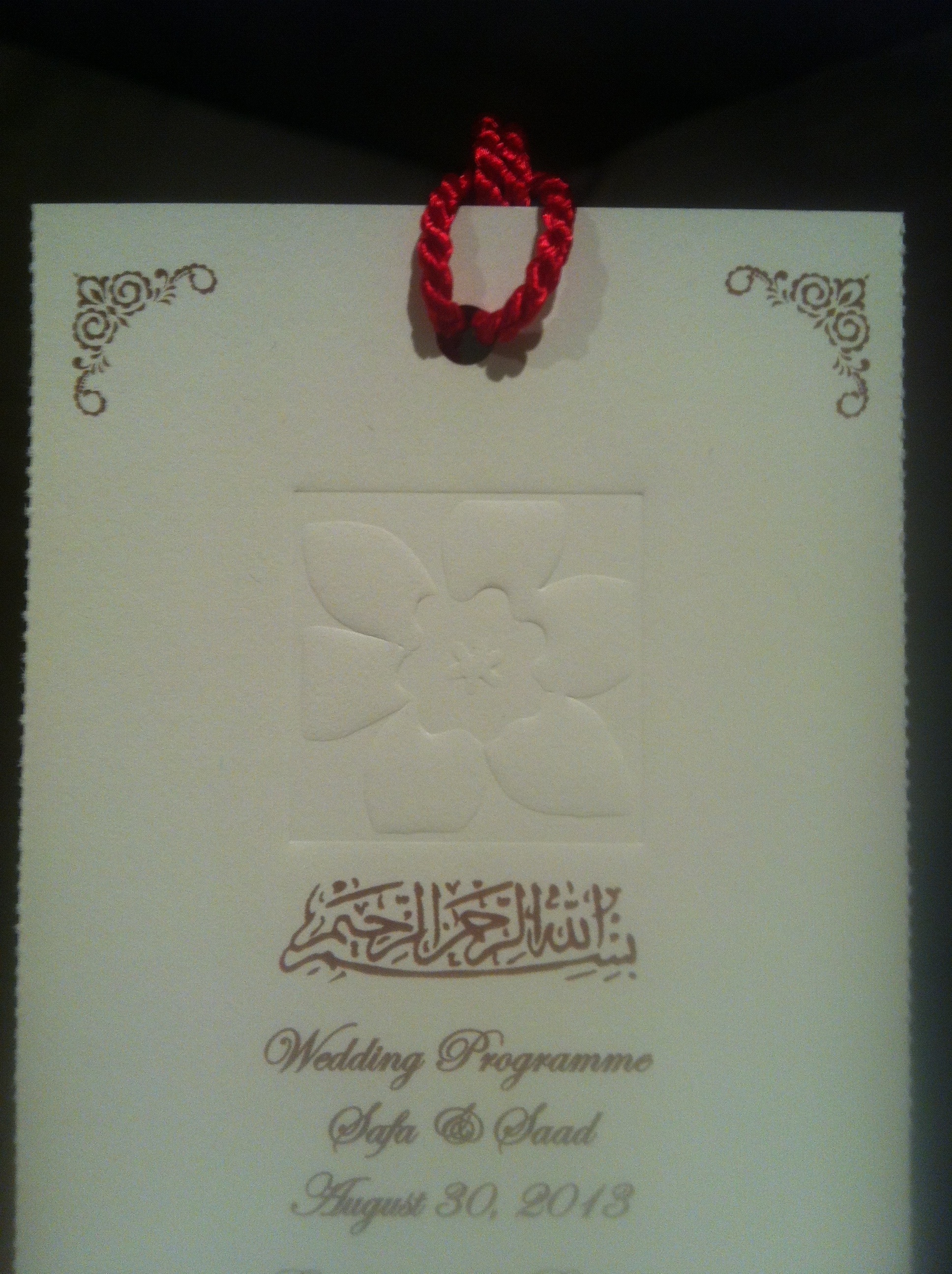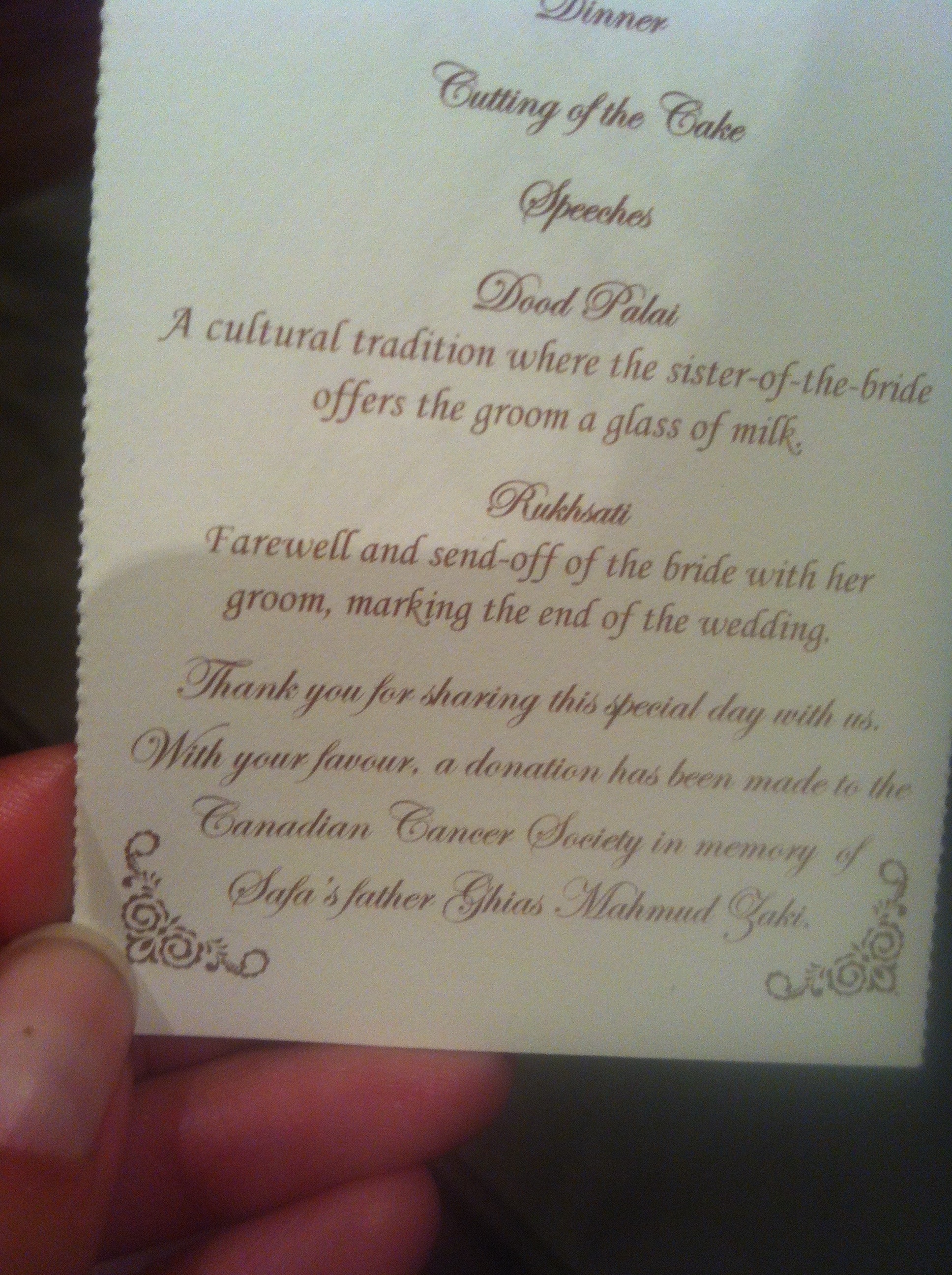 I decided that seeing as I wanted to have a wedding programme to give guests an idea of the sequence of events, instead of printing them separately, I would just have the programme printed on the bookmark itself, with the dedication at the end: “With your Favour a donation has been made to the Canadian Cancer Society in honor of Safa’s father, Ghias Mahmud Zaki.” I was quite happy with myself about this idea – cost savings and environmentally friendly!