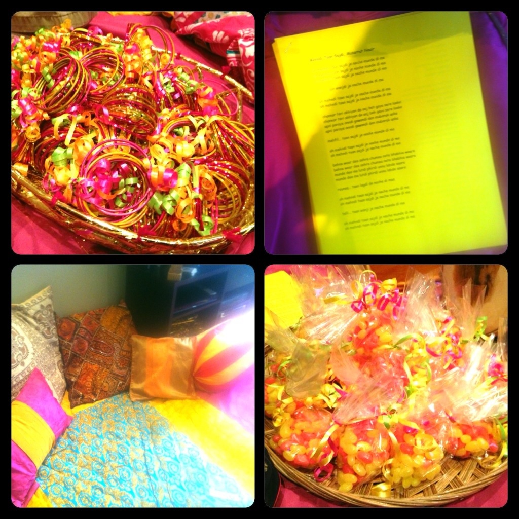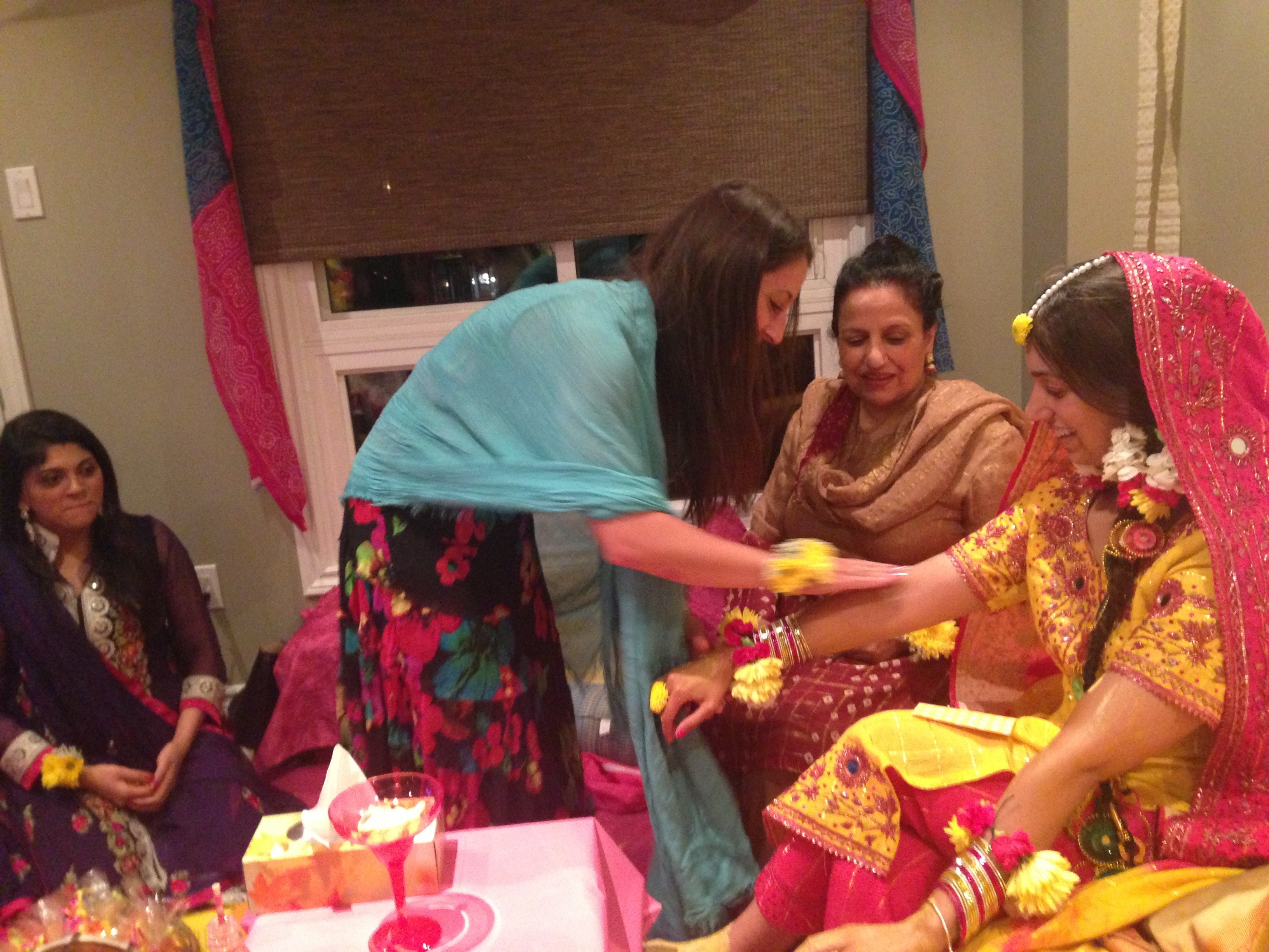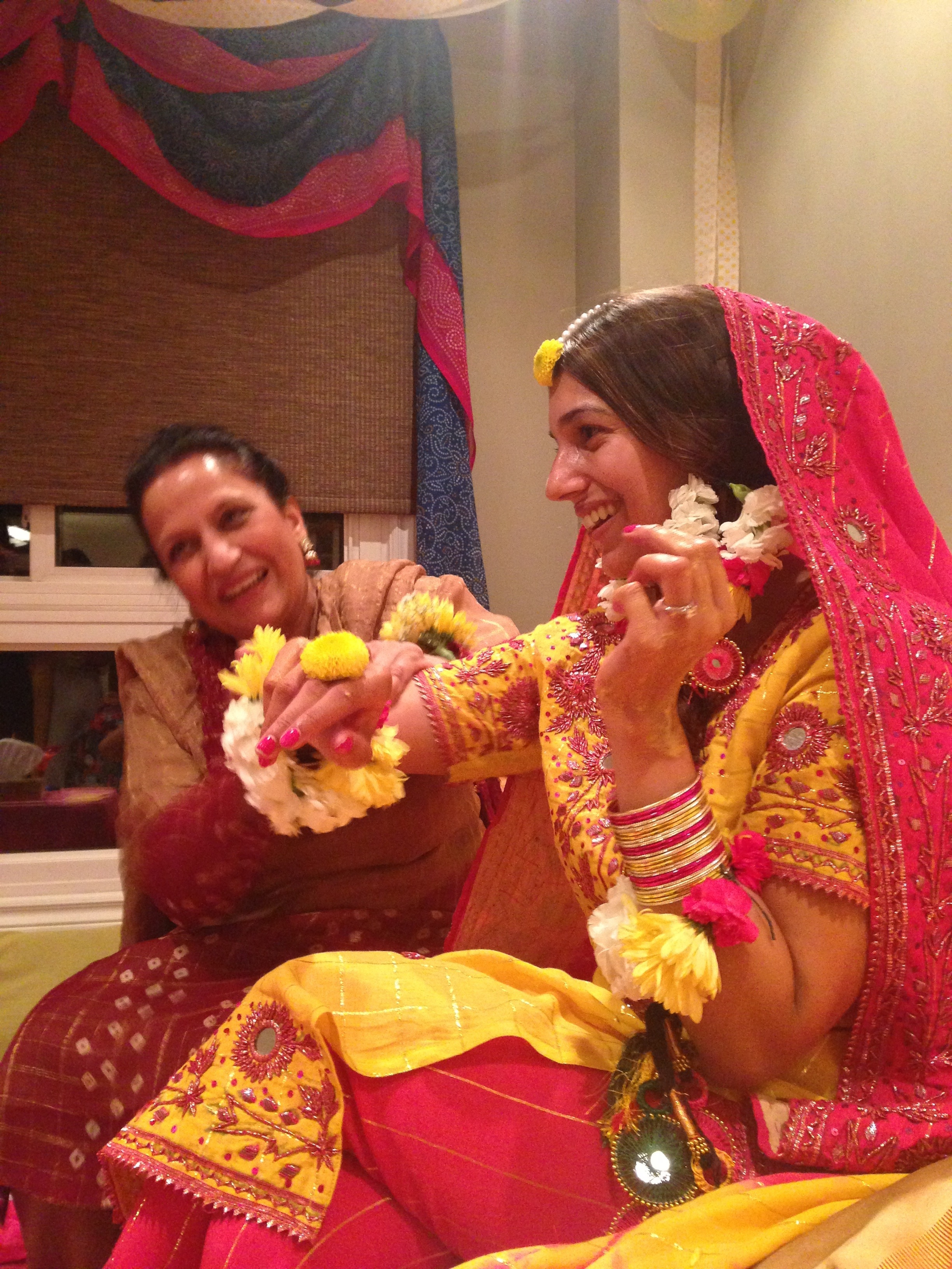 and my mom began conducting the rasms (traditional customs); telling my friends to feed me sweets, put ubtan (a yellow beautification paste made of tumeric but that she adapted to make with Nivea cream because I’m allergic to everything but) on my hands and feet “to make me white” (sigh, lol, our internalized racist views of beauty), and put flower jewelry on me. I’m sure for my friends this is an experience they will never forget! Here’s some of the going-ons of the evening: