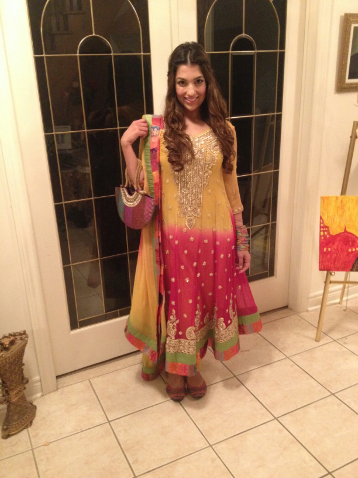 Hope everyone who is off is enjoying the holiday season! Yesterday I went to a mehndi and so I finally had the opportunity to wear the outfit I had made for my mayoun, but never ended up wearing! (Originally we were going to do a mayoun and invite all of SMs girls and have it at Lahore Tikka House, but then the restaurant didn’t save our date and so I decided to completely scale back the event and just have something very small at home! You can read all about it and what I ended up wearing here: link!)