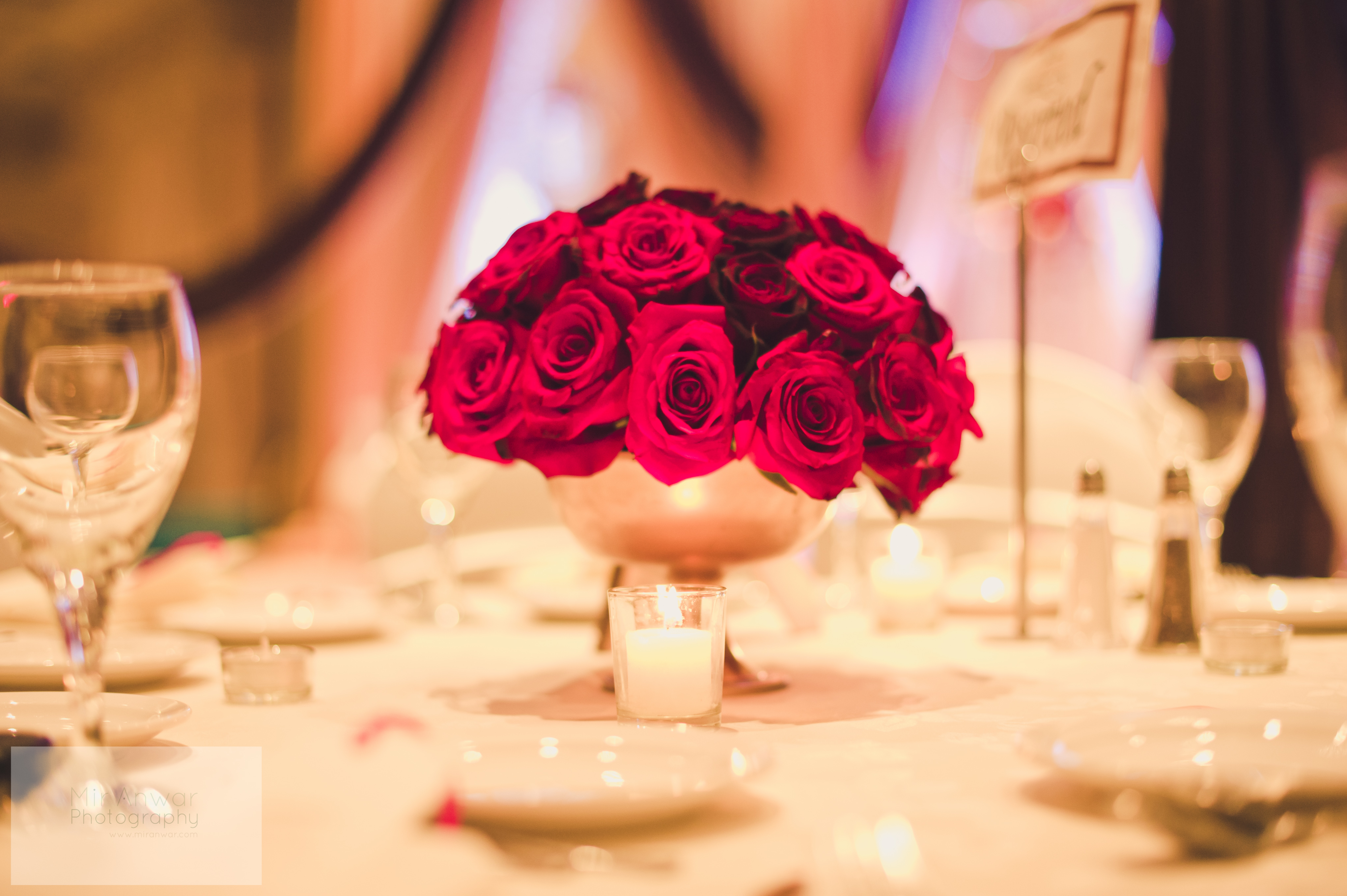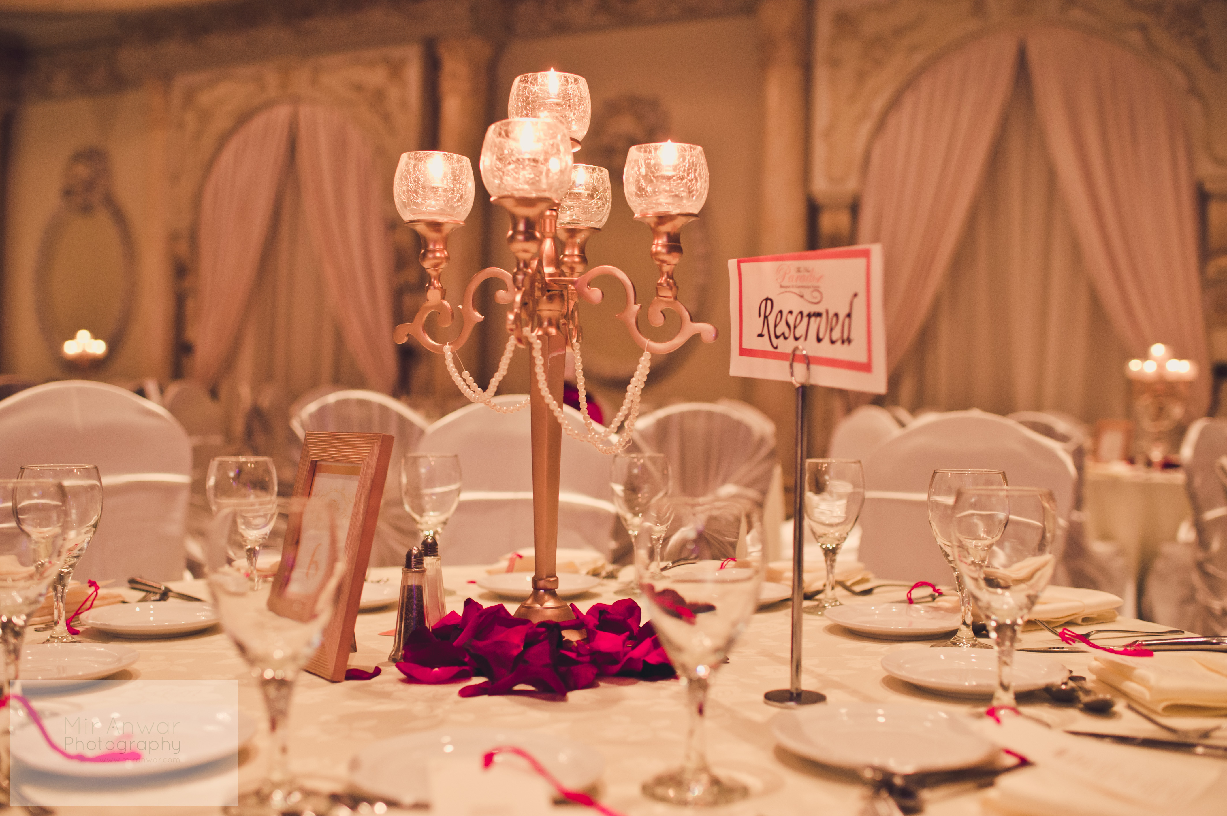 I was set on having my ombre red rose toppers at my wedding, and so on 15 tables I had floral arrangements (with candles of course), and on the other 15 I had dull gold candelabras with strands of pearls and fresh red rose petals (my decor theme!) scattered around the base. (Amna of Lemon Truffle designs spray painted the bowl vases that I specifically requested for the roses to match the gold of the candelabras!) The 15 candelabras were less expensive than the floral arrangements and when you multiply the cost by the number of tables (candelabras are priced per table) you can save a good chunk of change! Plus, the varying centerpiece heights add a visual element of interest to the room! Here’s what my centrepieces/rooms looked like:
