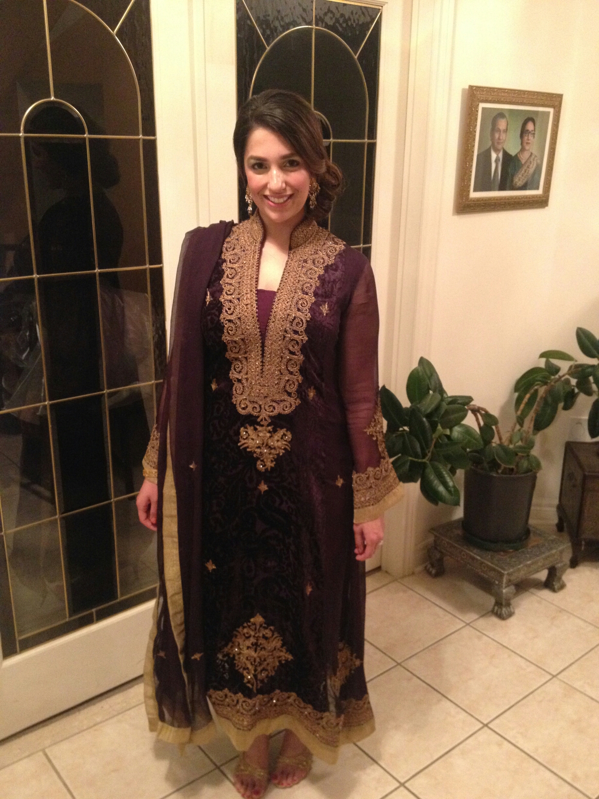I realized you can’t really talk about shopping for your wedding trosseau in Pakistan, without talking about buying unstitched kapray with completed kaam. When I was shopping in the PK last year, in addition to all of the readymade outfits that I got (which were the majority), I also got a few outfits from Liberty that were just unstitched kapra (cloth) but had all of the kaam (bewjewled work) already completed on it, so that you just had to take it to your tailor to have it stitched. I highly recommend this avenue to add ‘party’ outfits to your trosseau collection: you get to see all of the kaam already completed, the unstitched cloth is pretty reasonably priced, and as long as you have a good tailor you’re good to go! For example, this is an outfit that I had made in that way, that I wore to a wedding this past weekend. When I bought it, I bought it as a package of pieces of cloth with the kaam on the gala (neckline), the sleeves, and the border pieces, and then the fabrics for the actual suit itself. The price? 10,000 RPS (about $100) and the cost of stiching (which was about $30, and that’s on the pricier side because I had this outfit sewn in Defense). By comparison, I think in Canada you wouldn’t pay less than $300 for an outfit like this from a hotel exhibition!