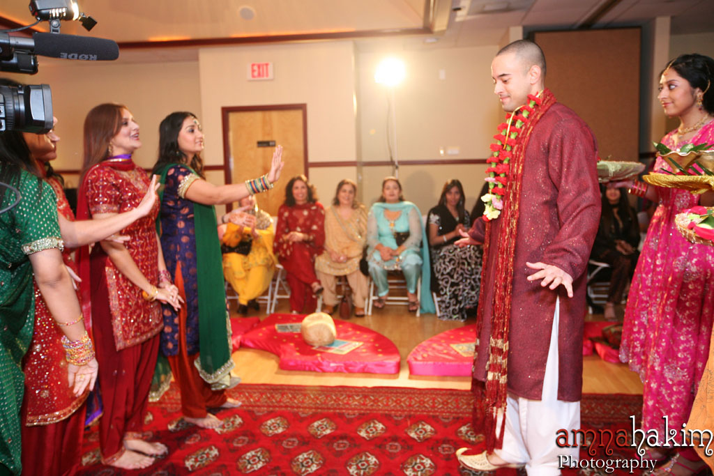We didn’t do this one, so I’m not exactly sure how it goes, but the idea is that that the girl’s side stops the groom from getting to his bride (until he pays them off – lol yes this is a theme). Again, it’s supposed to playful and fun! I’m not sure when it happens, in this photo it looks as though the sisters are doing it as the groom enters the hall on the mehndi!